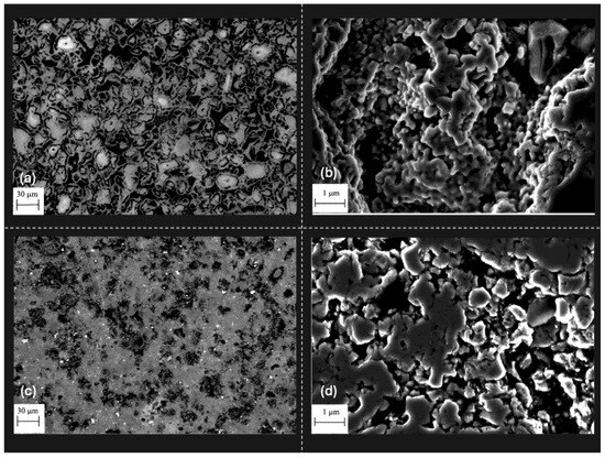 SEM micrographs of the Ti2AlC composite with 5 wt.% HfB2 sintered via (a,b) microwave-assisted heating and (c,d) conventional sintering. The microstructure obtained by the microwave sintering shows densification and refined grain distribution improved when compared with the conventionally sintered sample.