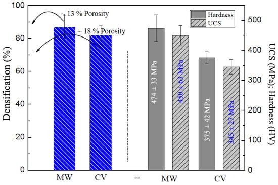 A comparative analysis of the mechanical properties of the examined composites under two different heat treatments is shown in Figure 6. This analysis indicates that lower porosity levels improve mechanical performance. Furthermore, the morphology refinement is achieved with the microwave treatment.