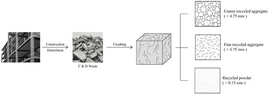 - Wang, B.; Yan, L.; Fu, Q.; Kasal, B. A Comprehensive Review on Recycled Aggregate and Recycled Aggregate Concrete. Resour. Conserv. Recycl. 2021, 171, 105565. [Google Scholar] [CrossRef]