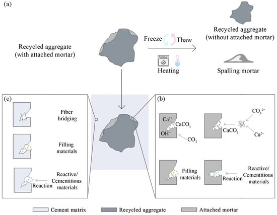 - Ji, A.; Luo, M.; Zhao, Y.; Dai, J. Modification of recycled aggregate using calcium carbonate formed by homogeneous precipitation and its application in concrete. Constr. Build. Mater. 2025, 462, 139998. [Google Scholar] [CrossRef]