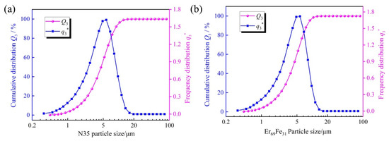 The cumulative distribution and frequency distribution of powder particles: (a) the sintered Nd-Fe-B magnet (N35), (b) Er69Fe31 alloy. q3* (q3lg)—Log-Normal Distribution.