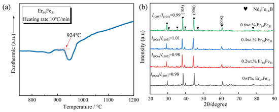(a) Melting point of Er69Fe31 alloy; (b) XRD patterns of the magnets evaluated along the alignment plane with different Er69Fe31 additions.