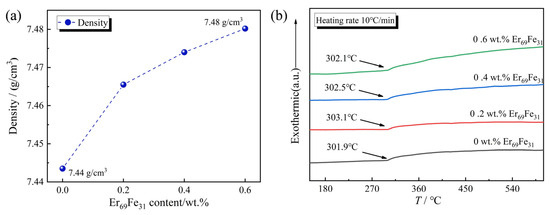 (a) Density of target magnets with different Er69Fe31 additions. (b) The Curie temperature of the target magnets with different Er69Fe31 additions.