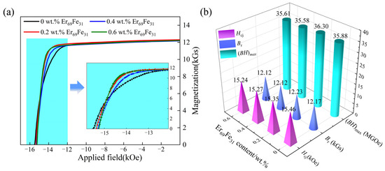 (a) Demagnetization curves of magnets containing different amounts of Er69Fe31, (b) variation in magnetic properties as a function of Er69Fe31 content.
