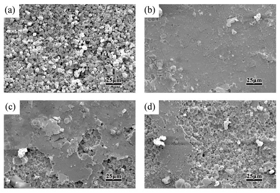 Figure 7 shows the magnets’ corrosion morphology after the polarization curve test. It can be found that the grain boundary phase of the initial magnet (Figure 7a) was corroded seriously, and the matrix phase became an independent grain, accompanied by some shedding phenomena. Combined with the analysis of the polarization curve test in Figure 6, the target magnet has the smallest corrosion area, and the best corrosion resistance is achieved at 0.2 wt.% Er69Fe31 addition. A small amount of Er elements dispersed in the grain boundary area that have a higher electrode potential than Nd elements, which can hinder the propagation of corrosion pathways in the grain boundary area and improve the anti-corrosive performance [18]. However, as the Er69Fe31 alloy addition continues to increase, the grain shedding phenomenon becomes more obvious, as shown in Figure 7c,d. This is due to the increased volume of Nd-rich regions, which elevates the probability of corrosion-prone sites in the magnet, consequently reducing its corrosion resistance. This indicates that moderate Er content can effectively slow the magnet’s corrosion rate.