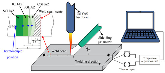 Figure 2 shows a schematic diagram of the temperature test system. The DP1180 steel plate (size: 200 × 100 × 1.2 mm) is welded by a JK2003SM (GSI, London, UK) Nd: YAG laser (Wuhan, CHN). The process parameters are as follows: 2.6 kW laser power, 28 mm/s welding speed, and−1 mm defocusing amount. According to the experience of many experiments, it can be determined that the coarse-grained zone, fine-grained zone, inter-critical zone, and sub-critical zone are, respectively, 0.5, 0.7, 1.0 and 1.4 mm away from the center of weld pool. The thermal cycle curve of each region can be measured by arranging the K-type thermocouple above the position, and then the temperature change curve of the thermal simulation can be determined (see Figure 3).