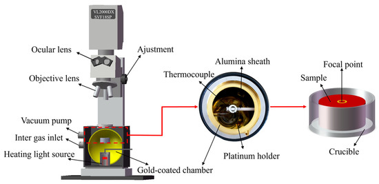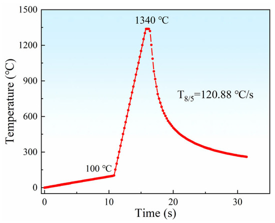 The material is cut into a disk with a diameter of 7 mm and a thickness of 1.2 mm. In situ observation experiments are performed on a VL2000DX-SVF18SP ultra-high temperature laser confocal microscope (YONEKURA MFG Co., Ltd., Yokohama, Japan), as shown in Figure 4. Before the experiment, the upper and lower surfaces and circumferences of the sample are polished with sandpaper, until the metal luster is completely exposed. Then, the upper and lower surfaces of the sample are ground using 240 #, 800 #, 1200 #, and 1500 # sandpaper in turn, while ensuring that the two horizontal surfaces are parallel. Subsequently, the observed surface is mechanically polished with a gold velvet polishing cloth. In the experiment, the prepared samples are placed in a ceramic crucible with a diameter of 7.8 mm and a height of 3.5 mm and set on a Pt sample bracket. The samples are cleaned with high-purity Ar gas (99.99%) three times after sealing the heating furnace, which is then filled with Ar gas to prevent oxidation during the whole experiment. According to the above experimental results, Figure 5 shows the welding thermal cycle curve of DP1180 steel by the LSCM. First, it increases to 200 °C at 53 °C/min, and then rapidly increases to 1350 °C at 989 °C/min. Then, it rapidly decreases to 200 °C at a rate of 1551 °C/min, finally dropping to room temperature. The curve is specially used to reproduce the welding thermal cycle process of the CGHAZ under laser welding conditions. The charge-coupled device (CCD) camera in the LCSM captures real-time images at a rate of 20 frames per second during the cooling process. The in situ observation results of the whole experiment are recorded in the video file.
