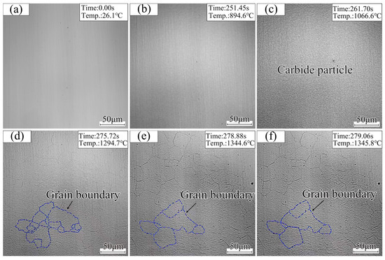 Figure 6a–f shows the in situ observation of the austenite grain growth behavior of DP1180 steel during heating. Austenite grain boundaries are blurred and difficult to observe at the beginning of the temperature rise in Figure 6a. The austenite grain boundary profile began to appear until the temperature reached 894.6 °C, as shown in Figure 6b. As the temperature increased to 1066.6 °C, a significant amount of carbide precipitated on the sample surface, as shown in Figure 6c. Subsequently, when the temperature reached about 1294.7 °C, the carbide particles were completely absorbed by the austenite grain boundary. At the same time, the austenite grain boundary contour became clear, the grains began to grow, and the growth rate increased greatly, as shown in Figure 6d. The austenite grain growth continued until 1344.6 °C, during which a small number of carbides precipitated on the grain boundaries (see Figure 6e). Beyond this temperature, the austenite grain size remained stable, and no further carbide precipitation was observed, as illustrated in Figure 6f.