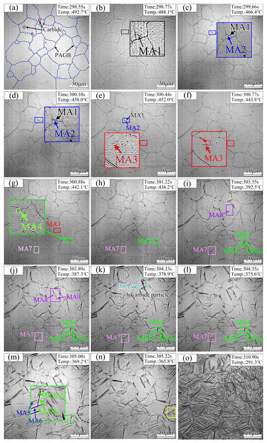 The blue dotted line indicates the PAGB, while the red circle represents the carbide particles that precipitated on the grain boundary and within the grain. The obvious relief effect on the specimen’s surface is a result of the difference in specific volume between martensite and the original austenite during the gradual cooling process from 1347.8 °C to 492.7 °C, as shown in Figure 7a. When austenite transforms into martensite, its volume expands, resulting in martensite relief [17,22]. In addition, Yang et al. believed that this phenomenon was caused by martensitic shear [18]. Therefore, it can be determined that 492.7 °C is the starting temperature of martensitic transformation.