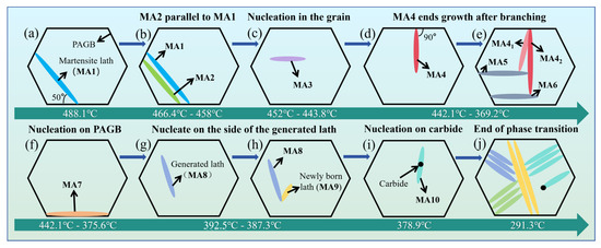 Model diagram of growth and evolution mechanism of martensite lath in CGHAZ of DP1180 steel: (a) MA1 nucleates at 50° with PAGB; (b) MA2 nucleates parallel to MA1; (c) MA3 nucleates in grains; (d,e) MA4 nucleates and grows at 90° with PAGB; (f) MA7 nucleates on PAGB; (g,h) MA9 nucleates on the side of MA8; (i) MA10 nucleates on carbide; (j) end of phase transition.