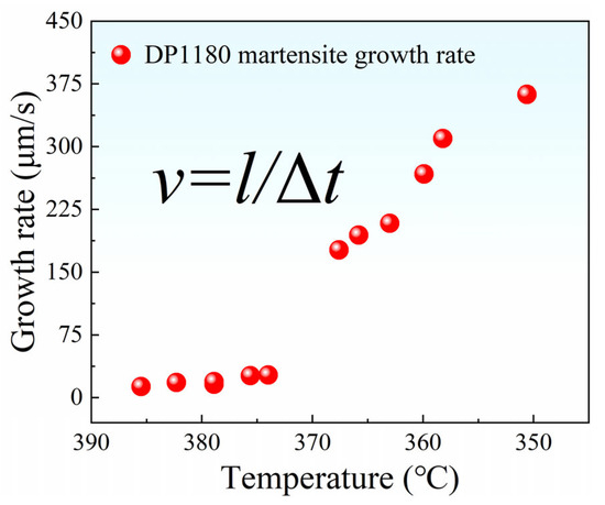 where l is the length of the lath, and Δt is the time used for the growth of the laths. The growth rate of martensite laths is calculated to be between 13.2~362.32 μm/s. The data presented reveals that the growth rate of the lath will increase significantly with the temperature decrease when the CGHAZ of DP1180 steel undergoes martensitic transformation, as shown in Figure 9. In this process, the nucleation order of the laths is mainly determined by the energy barrier, and the growth rate is dominated by temperature change. We assume that the prior austenite grain size, cooling rate, and other factors remain constant and unaffected by the change in phase transition temperature. The starting temperature of martensitic transformation is systematically calculated and analyzed according to the theoretical model proposed by Andrews [25], and the calculation formula is