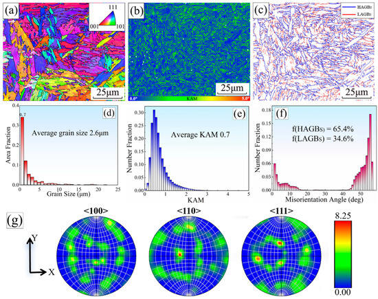 EBSD characterization of DP1180 steel CGHAZ: (a) IPF, (b) KAM, (c) distribution of grain boundaries, (d) grain size statistical chart, (e) KAM statistical chart, (f) histogram of angular distribution of vectorial difference, and (g) pole figure.