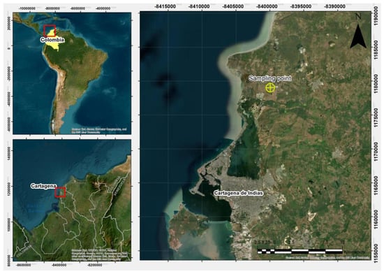 The soil studied originated from an urban expansion area north of Cartagena de Indias, Colombia, specifically at the geographic coordinates 10°30′21.8″ N, 75°28′27.1″ W (Figure 2). Additional characteristics of the site were described by Acuña et al. [29], who previously determined the dispersivity level of this clay using the pinhole test and the crumb test.