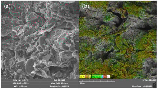 SEM images of the soil sample: (a) surface morphology captured in secondary electron (SE) mode; (b) backscattered electron (BSE) image with superimposed elemental mapping of the soil composition.