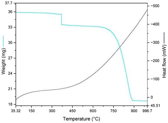 The thermal program involved an initial hold at 35 °C for 1.0 min, followed by a continuous heating ramp from 35 °C to 995 °C at 20 °C/min under a controlled atmosphere. The TGA curve shows three distinct stages of mass change. An initial weight loss below 200 °C corresponds to the release of adsorbed moisture. A slight decrease around 400 °C may be attributed to the decomposition of organic residues or trace hydrated compounds. The main decomposition occurs between 700 °C and 900 °C, associated with the breakdown of calcium carbonate (CaCO3) into calcium oxide (CaO) and CO2, as supported by similar findings in the literature [16,28].