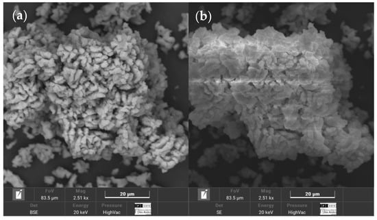 SEM morphology of lime WSL calcined at 800 °C for 2 h: (a) BSE image showing compositional contrast; (b) SE image highlighting surface topography.