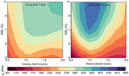 The mechanical behavior of the compacted mixtures treated with mollusk-shell-derived lime (WSL) was analyzed based on three key variables: the WSL content (3%, 7%, and 11%), the molarity of the alkaline activator (NaOH: 0.5 M, 1 M, 1.5 M, and 2 M), and the curing time (7 and 28 days). The primary parameter was the unconfined compressive strength (UCS), expressed in kPa. The results are presented in the contour plots of Figure 8, which illustrate how the UCS varies with the WSL content and molarity, comparing short-term (7 days) and medium-term (28 days) performance.