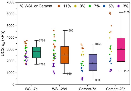 The unconfined compressive strength results reveal apparent differences between mixtures stabilized with WSL and those stabilized with Type III PC. For the 7 days of curing, WSL-stabilized specimens showed superior performance in terms of the minimum strength, reaching 1726 kPa compared to 393 kPa for cement, a more than 339% improvement in the minimum value. Even at a 3% dosage, WSL achieves strengths equal to or greater than those obtained with 7% cement, highlighting its early-age efficiency, especially at low binder contents.