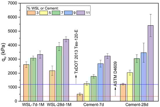 According to the experimental strength results, the alkaline activator with a molarity of 1 mol/L yielded the best performance compared to the other concentrations. Therefore, Figure 10 compares these results at 7 and 28 days of curing against the same values obtained from clay stabilized with Type III PC. The findings align with those shown in Figure 9, confirming that, at 7 days, the soil treated with WSL exhibits significantly better performance than the cement-stabilized soil, particularly at lower binder contents. However, this advantage decreases as the binder percentage increases. A similar trend is observed at 28 days: while WSL-treated samples outperform cement at 3% and 7% binder contents, the cement achieves higher strength at 11%, albeit with greater variability in the test results.