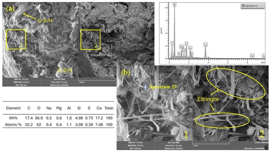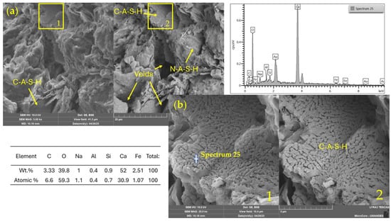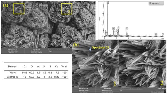 SEM/EDX images and elemental spectrum of a soil–WSL (7%)–NaOH 2 M stabilized mixture. (a) General view (field of view: 41.5 µm); (b) magnified area (10.4 µm). 1: SE detector; 2: BSE detector.