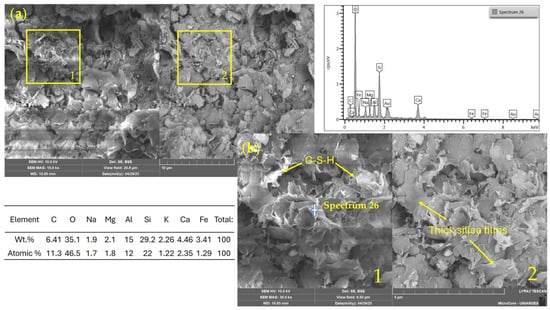 Figure 11a shows a heterogeneous microstructure of clay particles partially coated by geopolymeric or cementitious reaction products, such as C–S–H or C–A–S–H phases. Dense and bright agglomerates are visible, likely associated with calcium-rich compounds, including calcium silicate hydrate (C–S–H) or calcium carbonate (CaCO3), formed through the interaction between WSL and the soil’s native silicates. Microcracks and porous regions suggest an early stage of curing (7 days), where reaction products are still developing.