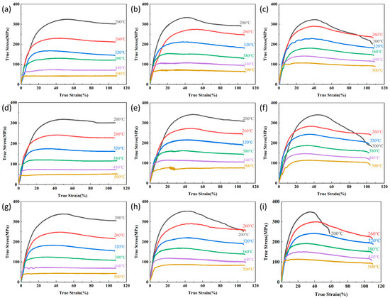 Figure 2, which illustrate variations in the Mg content, temperature, and strain rate. The curves show a rapid initial stress increase due to dominant work hardening. Under external loading, accelerated dislocation multiplication forms high-density dislocation cell structures, and the obstruction of subsequent dislocation motion leads to sharp rises in deformation resistance [