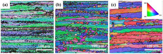 Figure 14 shows the IPF maps of 5383 alloys with varying Mg contents deformed at 440 °C/0.05 s