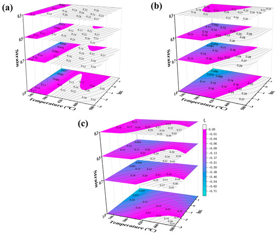 The three-dimensional thermal processing maps of 5383 aluminum alloys with varying Mg contents reveal several results. Firstly, at a constant strain rate, increasing the temperature or decreasing the strain rate markedly enhances the power dissipation factor. In high-temperature environments, the resistance to dislocation motion is diminished, allowing dislocations to continuously consume energy through slip rearrangement or annihilation. Moreover, elevated temperatures facilitate DRX and eliminate microscopic defects, such as dislocation plugging, thereby further improving energy dissipation efficiency. Low strain rates provide ample time for DRX and grain growth. Secondly, the peak power dissipation gradually decreases with increasing strain. This is attributed to the increased dislocation pile-up, which hampers energy consumption through rearrangement or annihilation and consequently reduces the energy dissipation efficiency of the DRV and DRX processes. Thirdly, the expansion of the destabilization region with increasing strain is closely linked to DRX. Under high-strain conditions, the stored energy generated by dislocation accumulation can serve as a driving force for DRX. However, abnormal grain growth and localized softening of recrystallized grains can significantly compromise the thermal processing stability of the material. Additionally, increased dislocation buildup can lead to localized stress concentrations, which contribute to the formation of microcracks and voids, thereby accelerating the material destabilization process.