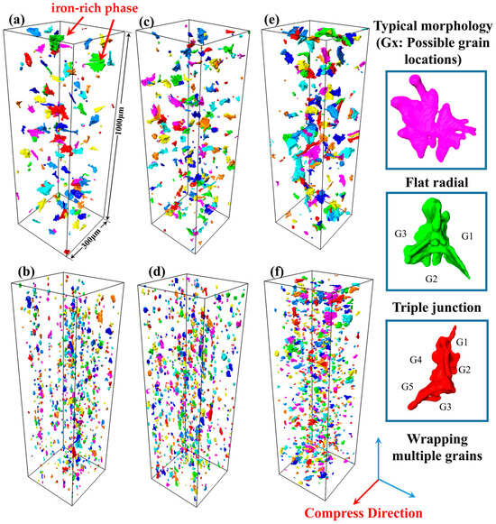 Figure 13a,c,e show the 3D morphology and distribution of the iron-rich phase with the increase in the Mg content before thermal deformation. It can be observed that most of the iron-rich phases before deformation are distributed as irregular particles, and the volumes of the iron-rich phases are slightly larger in the three typical areas: flat and dendritic outward radiation, a triangular distribution at the junction of the three grains, and a complex structure wrapped around multiple grains. The average size and volume of the Al
