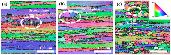 Notably, post-peak stress reduction becomes more pronounced with higher Mg concentrations. This phenomenon correlates with Mg’s dual role in solid solution strengthening and its interaction with iron-rich phases (Al6(Fe,Mn)). An elevated Mg content increases residual dislocation density while modifying the size and distribution of iron-rich phases. The resulting dislocation network provides abundant nucleation sites for DRX through orientation gradient accumulation at grain boundaries. Concurrently, enhanced dislocation pinning at secondary phases creates localized stress concentrations that accelerate DRX initiation. These coordinated effects promote intensive dynamic softening that overcomes prior work hardening, leading to significant stress reduction during the post-peak stress stage.