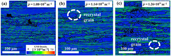 −1, further band refinement occurs with extensive subgrain boundaries and minimal recrystallization. Corresponding GND density maps (