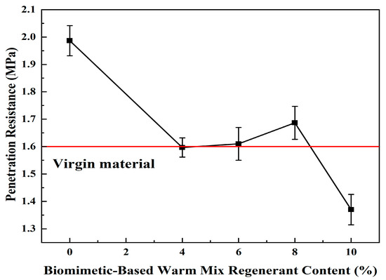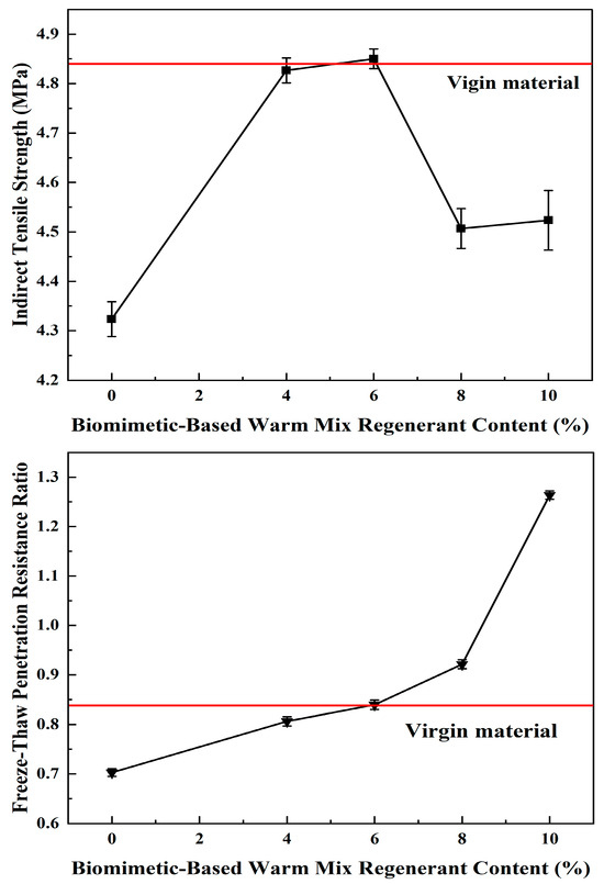Through uniaxial penetration, low-temperature splitting, and freeze-thaw penetration tests, the high-temperature, low-temperature, and water stability properties of the WMA-R mixture were determined, respectively, thereby determining the optimal amount of the best biomimetic-based warm-mix regenerant. The regenerator was added to RAP with 4%, 6%, 8%, and 10% biomimetic-based warm-mix regenerant of the old asphalt content. The test results are shown in Table 7 and Figure 2.