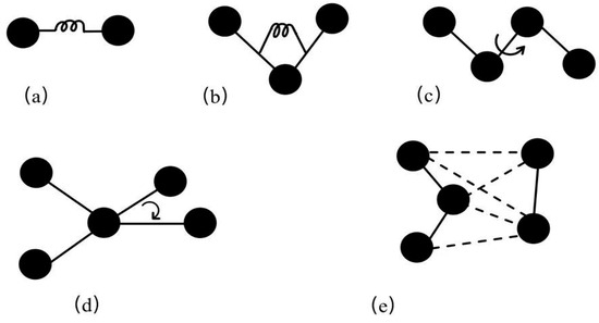 Energy terms. (a) Bond stretching, (b) angle bending, (c) dihedral angle, (d) improper torsion, (e) non-bonded [17].