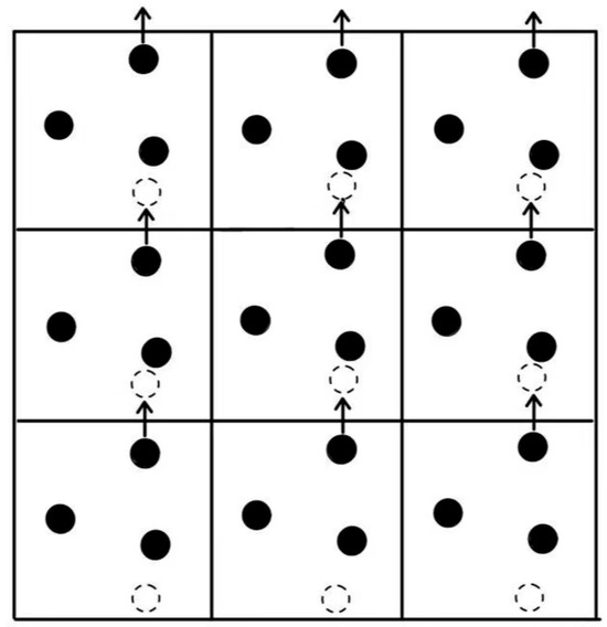 Molecular dynamics simulations face challenges handling massive particle quantities, where boundary conditions provide effective solutions. Boundary conditions mainly divide into periodic and non-periodic types. Periodic boundary conditions, one of the most prevalent approaches, are particularly suitable for simulating infinite systems. By treating the simulation domain as a repeating unit, particles reaching boundaries instantly reappear on the opposite side. This method effectively minimizes boundary effects in large-scale system simulations, with Figure 4 clearly illustrating its mechanism. Conversely, non-periodic boundary conditions prohibit particle re-entry once they exit the simulation domain.