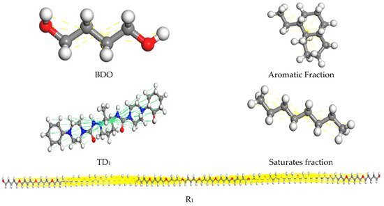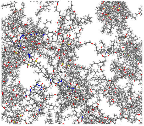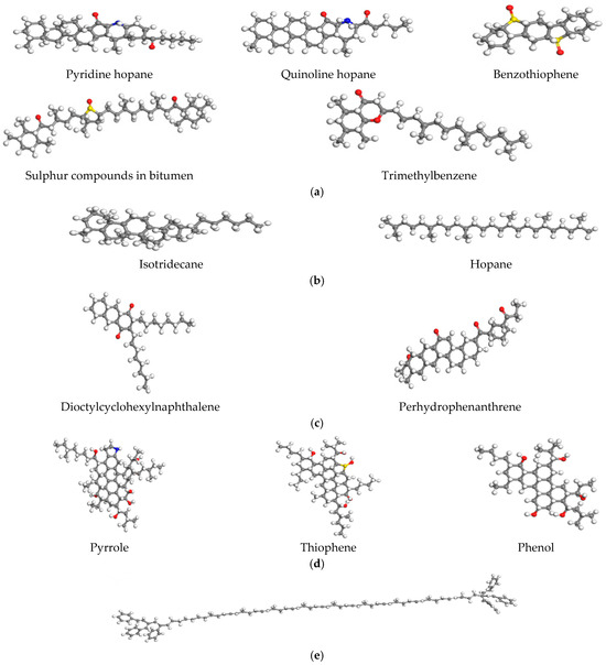 To more accurately reflect the micro-properties of asphalt materials, the molecular structures of each component are shown in Figure 5. In the following figure, the red, blue, and yellow parts represent oxygen atoms, nitrogen atoms, and sulfur atoms, respectively. Due to the limitations of computer capabilities, this project will control the number of atoms in the matrix asphalt model. Therefore, it is impossible to directly convert equally based on the macro data of the four components of matrix asphalt during modeling, so this project will be adjusted by manual trial calculation. This project constructed the SBS-aged asphalt molecular model under the premise that the overall molecular mass of the control model is similar and the proportion of the four components obtained by manual calculation is similar to the actual experimental results.
