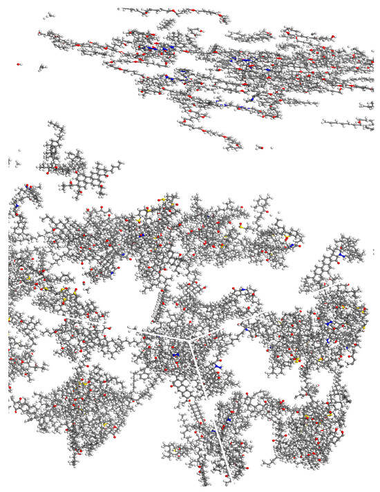 To make the system model closer to the real material, the structure optimization is performed through Geometry Optimization in the Forcite module and the energy convergence is set to be sufficient. Then, under the Compass II force field, the structure is annealed 10 cycles to cross the energy barrier to find the global optimal low-energy conformation. Finally, under the NPT and NVT ensembles, the asphalt model is brought to an equilibrium state and the asphalt is relaxed and balanced as shown in Figure 6.