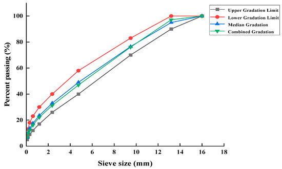 When conducting mix performance tests, the mix ratio between RAP and new aggregates must meet the requirements of the asphalt mixture grading design specifications. 30% RAP is used instead of new materials. The raw material grading and grading ranges are shown in Table 9 and the grading curve is shown in Figure 10. Meanwhile, the AC-13 gradation provides an appropriate skeletal structure with 40–60% passing rate at 4.75 mm sieve, which not only ensures sufficient contact between the regenerant and aged asphalt, but also maintains a dynamic stability exceeding 3000 cycles/mm under low-temperature mixing conditions while preserving excellent workability during construction. The AC-13 type grading median is used as the synthetic grading.