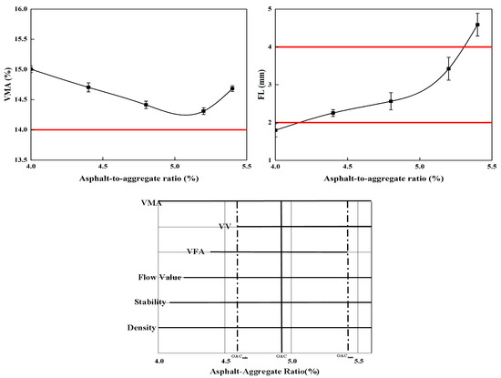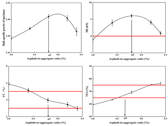 According to the Marshall test results of Table 10, the requirements of the “Technical Specifications for Highway Asphalt Pavement Recycling” (JTG/T 5521-2019) and the “Technical Specifications for Construction of Highway Asphalt Pavements” (JTG F40-2004), the relationship curve charts are drawn with the oil-stone ratio as the horizontal coordinate and the Marshall test indicator as the vertical coordinate, as shown in Figure 11.