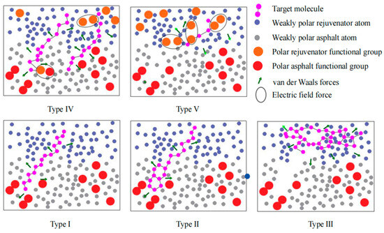 Figure 12 shows the molecular properties of the biomimetic-based warm-mix regenerant. It can be seen from the MS results that the biomimetic-based warm-mix regenerant molecules should be chain-like, low-polar, and have small cohesive energy, which is conducive to reducing viscosity, rapidly diffusing into the asphalt, avoiding volatility, and reducing costs. A schematic diagram of the mechanism of action of a biomimetic-based warm-mix regenerant is shown in Figure 13.