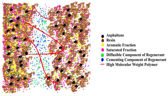 According to the above two theories, aging asphalt regeneration means better-dispersing asphaltene in aromatic and saturated parts under the action of colloids, forming a stable colloidal structure, and the rheological properties of asphalt being changed, so that the asphalt performance meets the requirements of quality indicators [18]. That is, mix the soft components rich in aromatic parts into aged bitumen in a certain proportion to create a new and more reasonable bitumen component. According to the asphalt colloid structure theory, based on the research on aging performance and grade classification, appropriate regeneration methods are selected for the aging degree of recovered asphalt. While improving the rheology performance of regenerated asphalt, the amount of cementitious materials on the old asphalt pavement should be increased as much as possible [19]. The method is based on component harmony and compatibility theory as the theoretical basis. The specific measures usually involve the addition of new asphalt materials and regenerators.