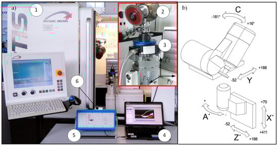 A dedicated test stand for investigating the flute grinding process of solid carbide end mills was developed based on the FORTIS five-axis grinding center (ISOG Technology GmbH, Weilheim, Germany) as a base (No. 1 in Figure 2a). Notably, this advanced tool grinder is designed for the production and regrinding of various cutting tools, including drills, milling cutters, taps, and custom-profile tools. It operates as a five-axis vertical CNC grinding center equipped with three linear axes (X, Y, Z) and two rotary axes (A, C), allowing full interpolation. Figure 2a presents a general view of the machine along with the measurement setup, while Figure 2b shows the machine tool axis configuration.