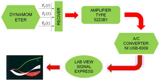 The principle of the measurement system operation is graphically presented in Figure 3. The force components recorded by the rotary dynamometer are digitized via a 12-bit A/C converter and transmitted wirelessly to a stationary receiver. Subsequently, the data is relayed through a transmission cable to the 5223B1 signal amplifier (Kistler Group, Winterthur, Switzerland), where it is reconverted into an analog form for further processing. The signals are then fed into the NI 9215 A/C converter by National Instruments (Austin, TX, USA), controlled by LabView Signal Express 2013 V7.0 software, which records the measurement signals on a computer. The data acquisition rate of 5 kHz ensured sufficient resolution for measuring the grinding force components.