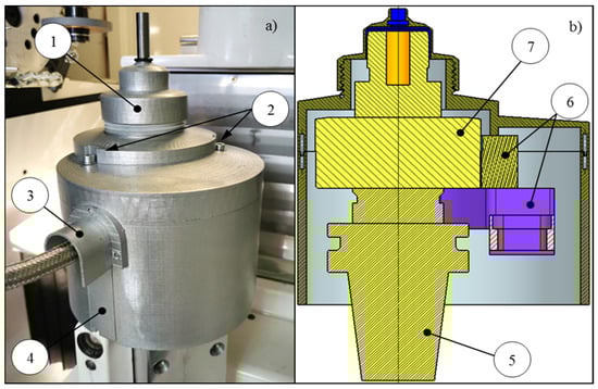 Dynamometer cover: (a) manufactured and installed cover; (b) cross-section area: 1—nut, 2—mounting screws, 3—protective cap, 4—slider, 5—SK50/HSK63 adapter, 6—mounting structure for stationary signal receiver, 7—dynamometer.