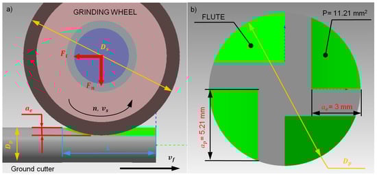 Kinematics of five-axis, single-pass flute grinding: (a) front view, (b) side view. Ft—tangential component of grinding force, Fn—normal component of grinding force, Ds—grinding wheel diameter, vs—cutting speed, vf—feed rate, Dp—blank diameter, L—grinding length, ap—grinding depth, ae—grinding width, P—cut layer cross-sectional area.
