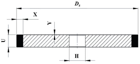 Geometric dimensions of type 1A1 grinding wheel: Ds—outer diameter, U—width, X—abrasive layer height, H—inner diameter, Y—chamfer size [].
