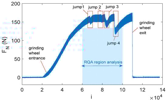 The analysis of cutting force measurements revealed four distinct amplitude jumps at varying levels. The first two jumps exhibit similar characteristics, with an amplitude force of approximately 156 N and a relatively minor variation of about 5%. However, the third jump shows a decrease of approximately 10%, while the fourth drops by 22% compared to the stable grinding process. These jumps are considered the initial indicators of defects emerging in the ground tool. Therefore, the regions with jumps were analyzed in detail using a classical approach of statistical analysis (range, square deviation, standard deviation, variance, coefficient of variation, kurtosis, and skewness), and using recurrence analysis, which is more advanced method dedicated to nonlinear signals.
