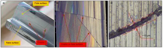 In the analyzed case, the recorded force spikes during the grinding process (jumps 1–4) were directly responsible for the formation of the cracks shown in Figure 8. These defects were identified on the flute surface, the rake face, and the cylindrical surface. Additionally, cracks were observed in both the upper and lower sections of the end mill. Figure 8 highlights selected cracks that were detectable under appropriate lighting conditions without the need for additional equipment (Figure 8a). Despite the presence of multiple defects, the examined sample initially appeared intact. Only microscopic analysis revealed cracks that remained undetectable under standard visual inspection (Figure 8a,b). Using a 100× magnification lens, the width of the resulting cracks was measured, averaging 10 μm. Additionally, it was observed that the cracks exhibited an irregular edge (Figure 8c). The analysis of the obtained images revealed that the cracks were oriented in various directions, including both axial and radial, regardless of the grinding direction (Figure 8b).