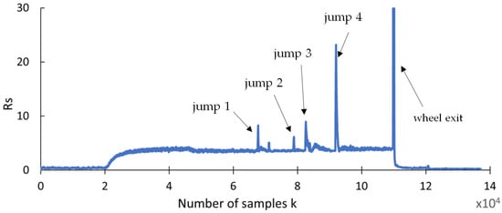 An analysis of the chart in Figure 9 reveals that the range indicator (Rs) exhibits significant variations in magnitude at the points in the waveform where signal spikes occur. Furthermore, for a monotonic waveform, the values remain stable, except at the locations influenced by these spikes. This suggests that Rs can be used both for detecting jumps and as a defect indicator.