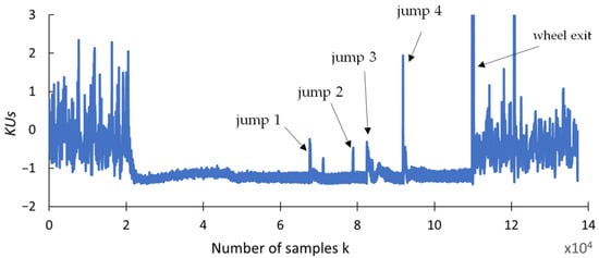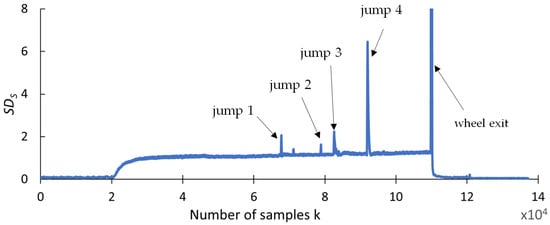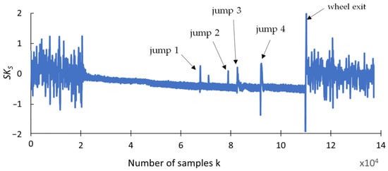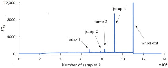Next, Figure 10 illustrates significant variation in the amplitude of the SQs index. The square deviation index SQs, due to its inherent characteristics, disproportionately emphasizes larger spike values, while smaller changes in the signal are less noticeable. This is an undesirable trait, as the ability to detect as many microcracks as possible is a key requirement. The SQs can detect four jumps and can be used for crack identification.