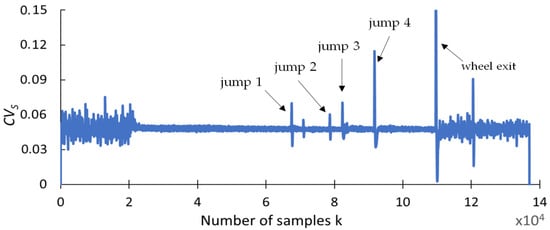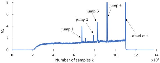 When analyzing the variance signal vs. shown in Figure 12, it can be seen that its course is similar to that of the square deviation index SDs. The index excessively differentiates the error values. Against the background of large values, jumps with smaller values appear less pronounced.